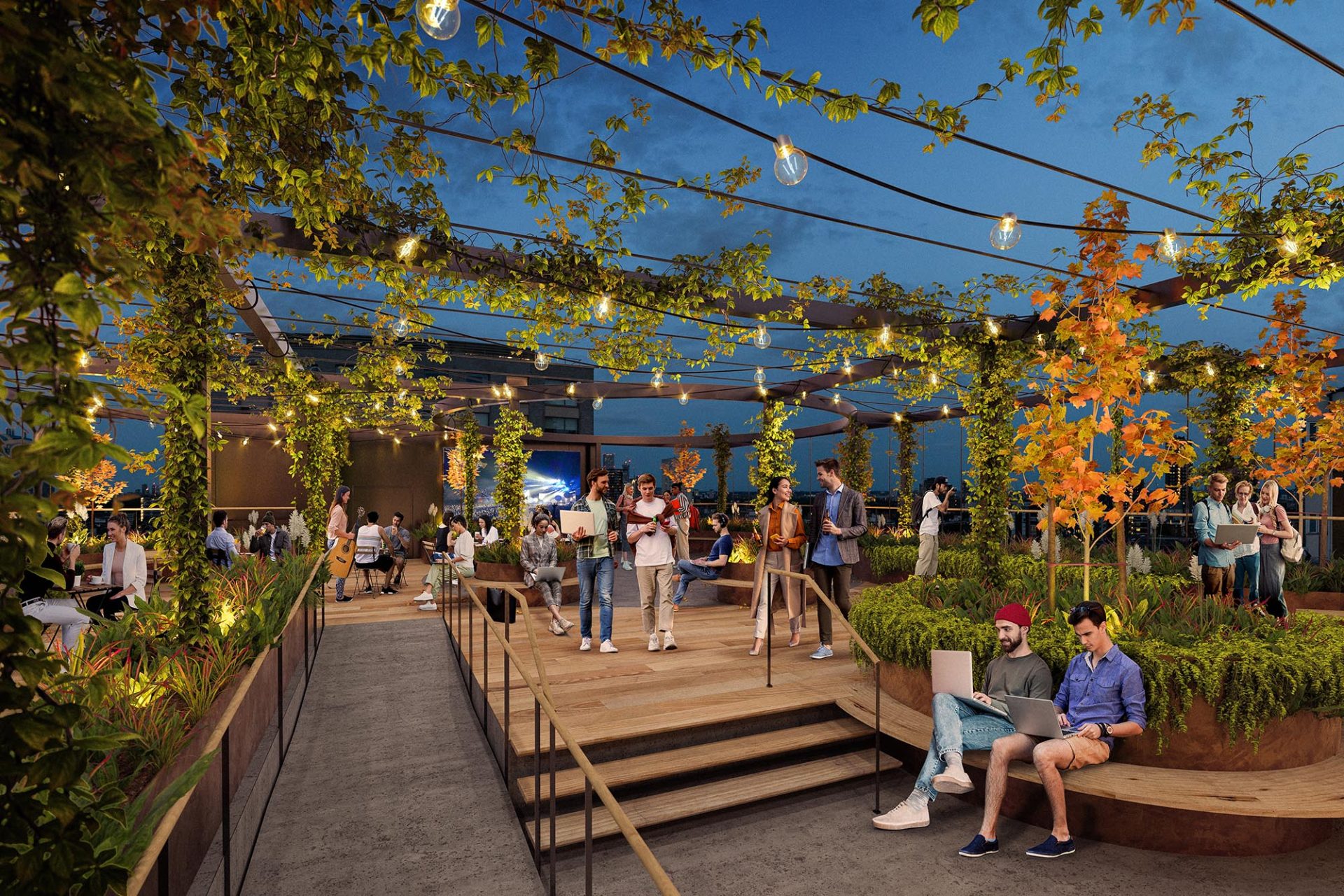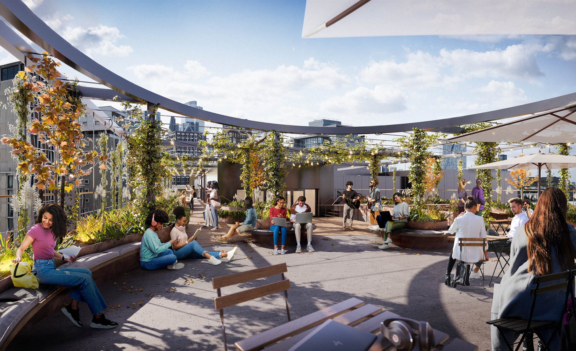 Biodiverse private rooftop terrace with panoramic views of the City, alongside spaces for yoga, drinks, events and reflection. Available to let.